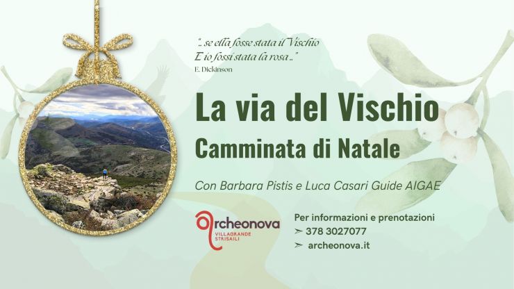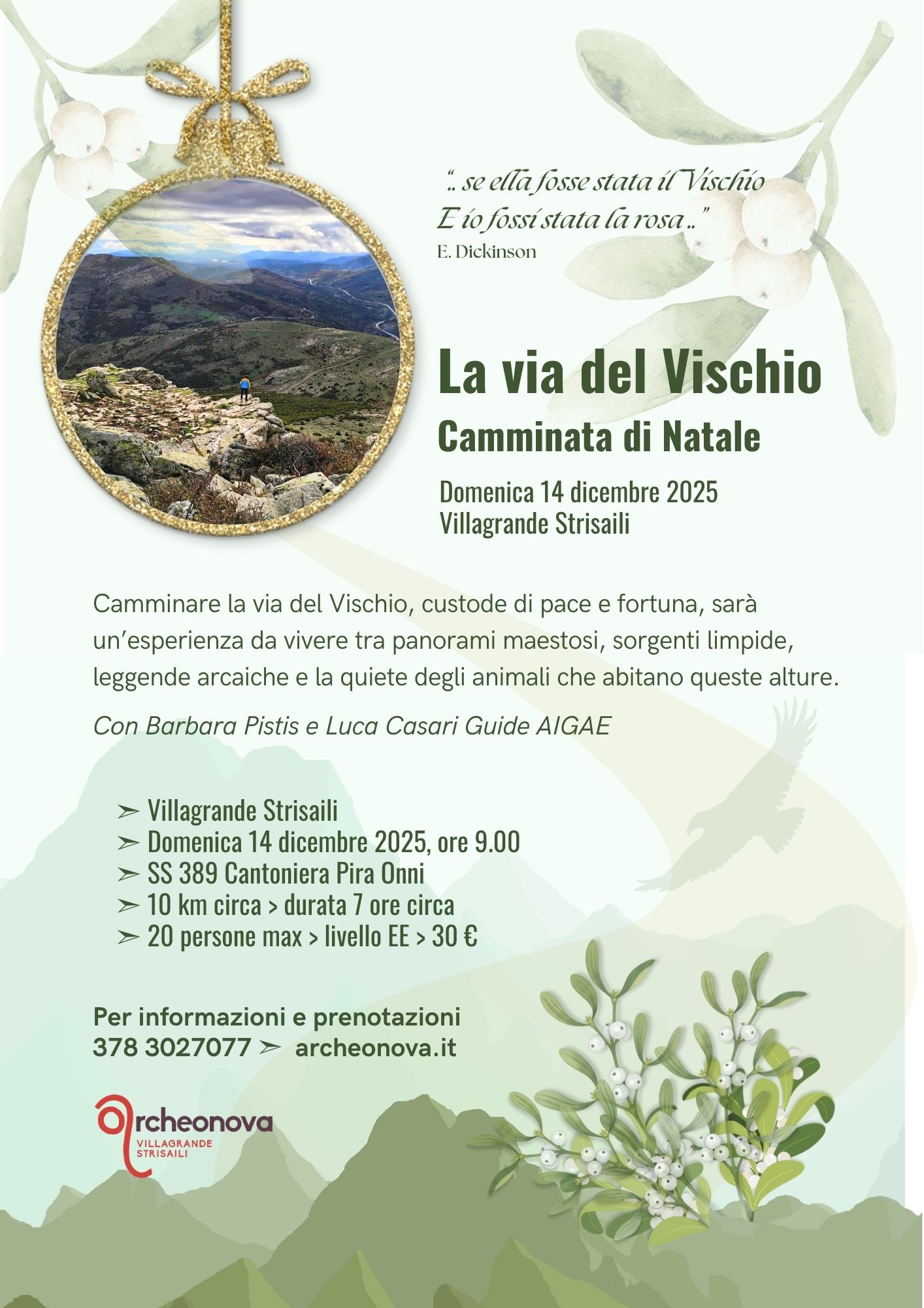 Il 14 dicembre 2025 la società Archeonova vi invita a partecipare ad una nuova escursione di Natale, in un territorio di confine tra Villagrande e Orgosolo per percorre insieme la Via del Vischio: vi racconteremo la sua storia, le sue proprietà, i simboli a cui è legata, leggende e pozioni magiche e, se saremo fortunati e poco rumorosi, avremmo il privilegio di incontrare aquile e mufloni, padroni di casa di questo meraviglioso angolo di Sardegna.