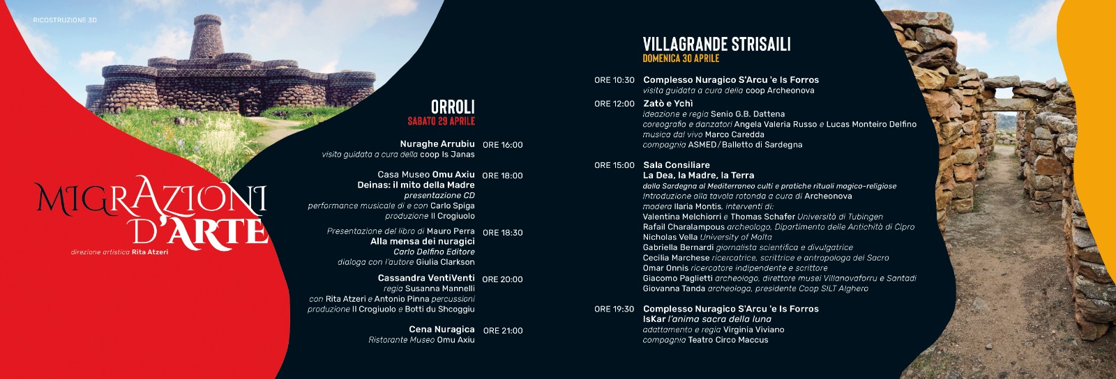 Spettacoli di teatro, musica e danza animeranno il Nuraghe Arrubiu di Orroli e il santuario nuragico di S’Arcu ‘e is Forros a Villagrande dove, nel pomeriggio di domenica 30 aprile, si terrà il convegno "La dea La madre La terra: dalla Sardegna al Mediterraneo culti e pratiche rituali e magico-religiose", avente ad oggetto il rapporto tra archeologia e animazione culturale e coordinato da Ilaria Montis.
