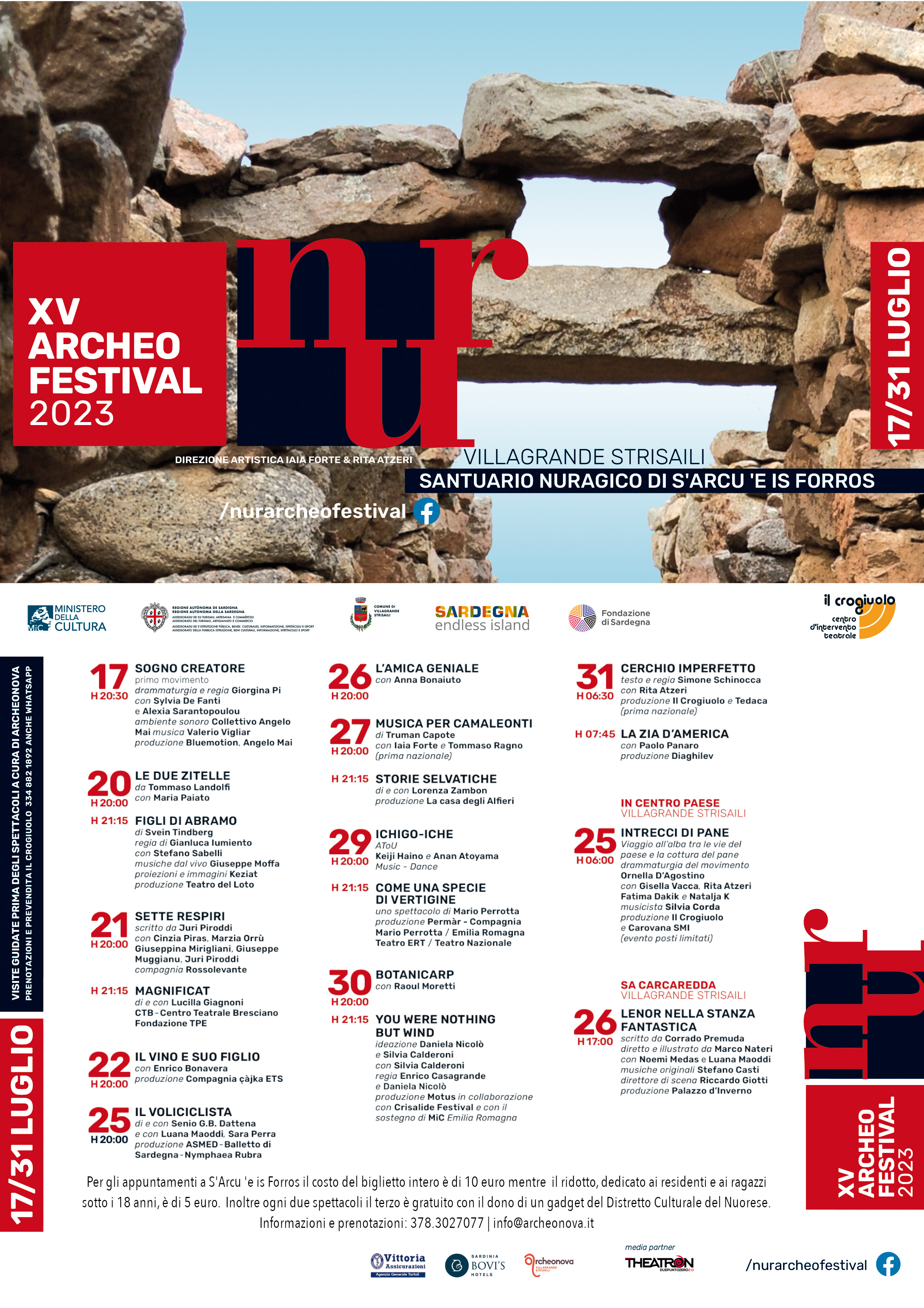 Il NurArcheoFestival, che quest'anno avrà luogho a Villagrande Strisaili e Tortolì, è organizzato da Il crogiuolo, compagnia teatrale fondata da Mario Faticoni e diretta da Rita Atzeri, con il sostegno del MiC, degli Assessorati del Turismo e della Cultura della Regione Sardegna e del Comune di Villagrande Strisaili.