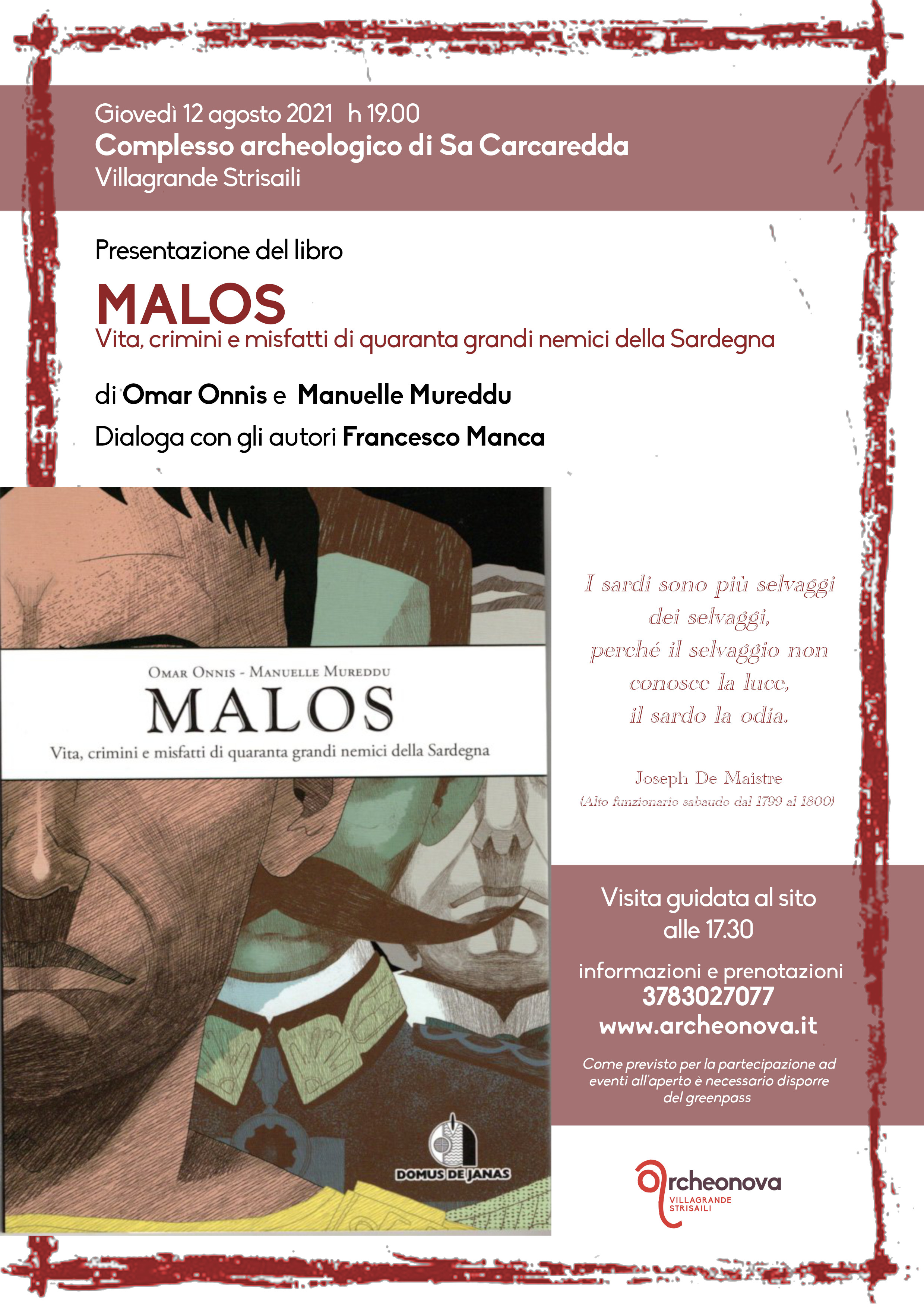 Giovedì 12 agosto alle 19:00, nello spazio accogliente e fresco dell’esedra della tomba di giganti di Sa Carcaredda, Omar Onnis e Manuelle Mureddu, introdotti dall’amico e collega Francesco Manca, presenteranno il loro ultimo libro “Malos. Vita, crimini e misfatti di quaranta grandi nemici della Sardegna” edizioni Domus de Janas.
