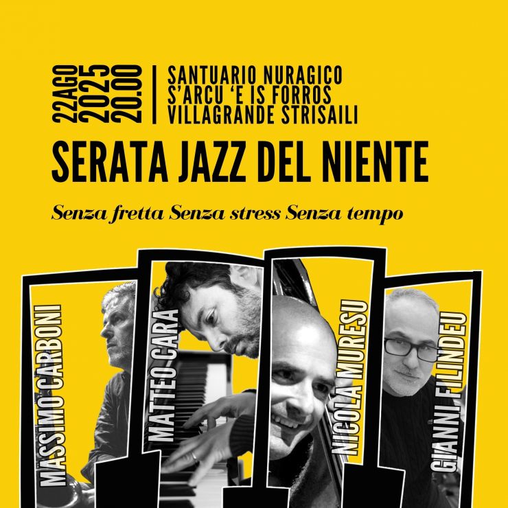 La serata inizierà alle 18:30 con la visita guidata al santuario nuragico di S’Arcu ‘e is Forros per proseguire alle 20:00, con la musica del quartetto Inner Energy: Massimo Carboni al sax tenore, Matteo Cara al piano, Nicola Muresu al contrabbasso e Gianni Filindeu alla batteria proporranno un concerto pensato per dialogare con le strutture del sito archeologico.