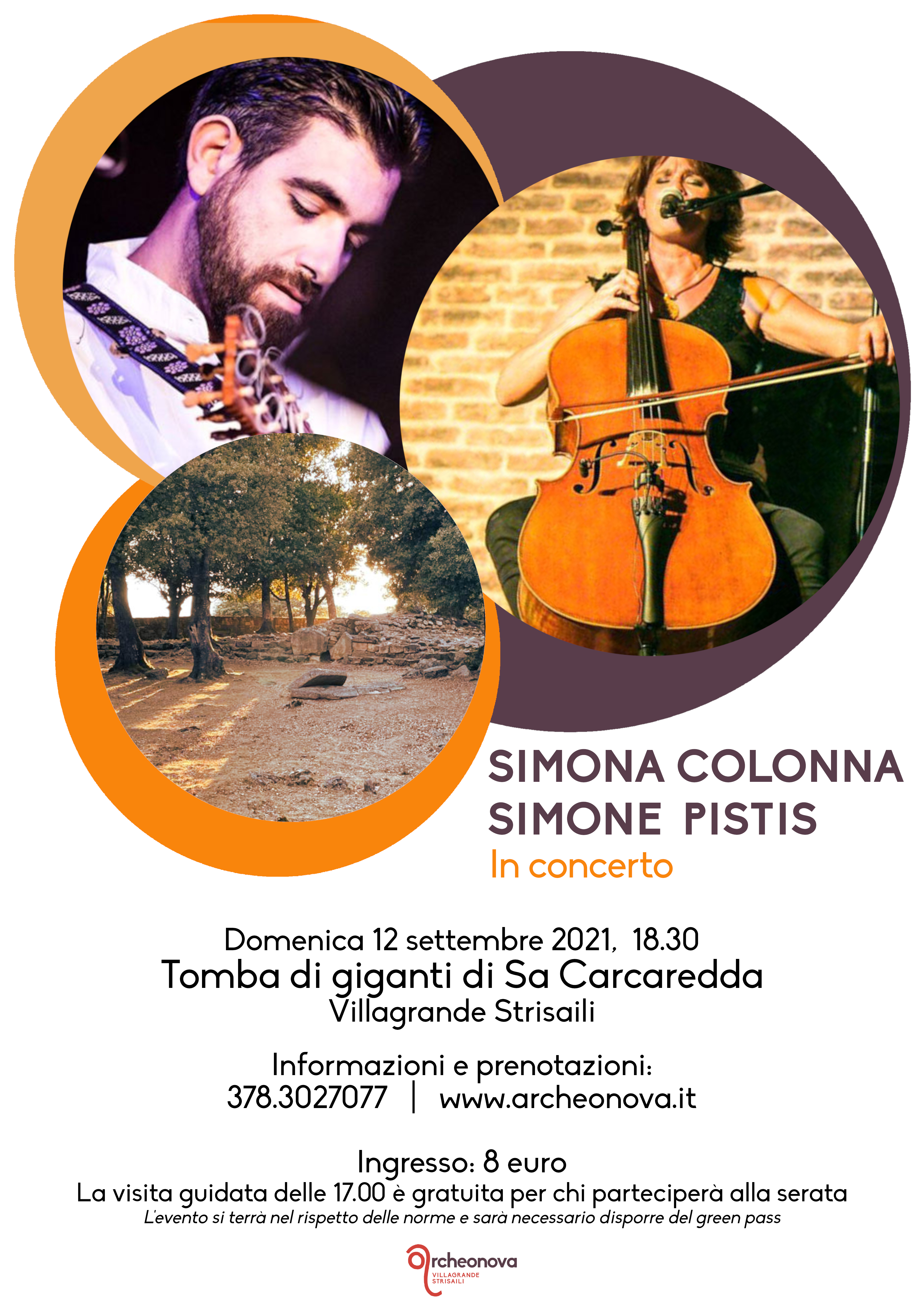 Il 12 settembre 2021 alle 18.30, davanti alla monumentale Tomba di Giganti di Sa Carcaredda a Villagrande Strisali, all’ombra dei lecci secolari che caratterizzano il sito, risuoneranno la voce e il violoncello di Simona Colonna che si uniranno alla chitarra e all’organetto di Simone Pistis per condurci in un viaggio contemporaneo nelle atmosfere della musica popolare sarda e piemontese.
